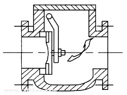 壓縮機組原設計的止回閥是擺臂式結構。擺臂式止回閥的工作原理是:在氣流產(chǎn)生的壓差力大于密封元件的重量時打開,在力小于密封元件的重量時關閉。從圖1可以看出,該型止回閥是用一個大閥板作為密封元件,閥板的一端由鉸鏈固定,另一端自由運動。閥板以鉸鏈為中心上下擺動來完成止回閥的開和關。