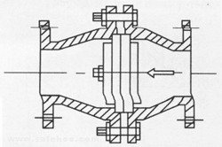 針對擺臂式止回閥在現(xiàn)場使用中出現(xiàn)的問題,我們經(jīng)過深入分析認為,從關閉位置到開啟位置,止回閥閥板必須以管路的名義直徑為半徑旋轉90度角。閥板的自由端速度可達幾十米每秒,這樣就可能導致閥座與閥板之間嚴重的沖擊而發(fā)生失效。并且閥板從一開啟位置回落到關閉位置這段時間內(nèi),回流現(xiàn)象較易發(fā)生。在脈動氣流的作用下,止回閥將會較高頻率地開閉,一段周期后,將使鉸鏈銷加速磨損以致斷裂,一旦斷裂就會對管線、設備造成很大的破壞,嚴重時還會出現(xiàn)安全事故。止回閥較高頻率的開閉還造成閥板固定螺母松動,導致閥板脫落。另外,由于內(nèi)部無潤滑條件,使用中鉸鏈的銷和孔之間的間隙容易生銹被卡住,導致閥板移動不靈活而失效,必須對其進行經(jīng)常性地維護,而這種維護又會造成密封件的損壞。