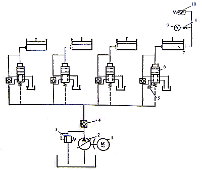 1-電動機 2-高壓液壓泵 3-溢流閥 4-單向閥 5-限位開關 6-卸荷閥