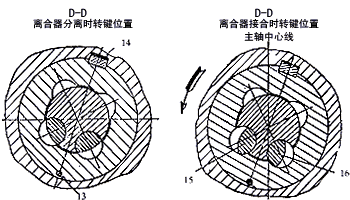 控制轉鍵的轉動原理是這樣的(見圖1的C-C剖視圖):當需要離合器結合時,轉動關閉器9,讓開尾板10在彈簧12作用下,尾板連同工作鍵有逆時針旋轉趨勢,只要中套和曲軸的圓槽對正,則工作鍵立刻逆時針轉過一角度,卡在中套和曲軸圓形槽中間,大齒輪借助中套和工作鍵帶動曲軸旋轉。