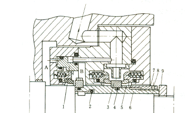 ??? 雙端面主機(jī)械密封動(dòng)環(huán)3,由鎖緊套8壓緊在機(jī)械密封套6上,動(dòng)環(huán)下面裝有O形密封環(huán)4。動(dòng)環(huán)和軸套間無驅(qū)動(dòng)銷,依靠兩端面壓緊產(chǎn)生的摩擦力,使其隨軸套一起轉(zhuǎn)動(dòng)。為防止動(dòng)環(huán)鎖緊套8松動(dòng)退出,鎖緊套后部還設(shè)有四個(gè)周向均布的防松螺絲7。單端面輔助機(jī)械密封環(huán)也裝在機(jī)械密封軸套上,靠鎖緊套9壓緊。