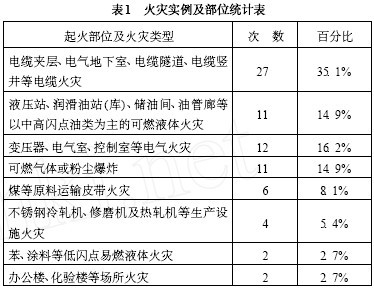 表1 是對近十年來鋼鐵冶金企業在生產過程中發生的74起火災實例及其起火部位和火災類型的統計和分析。雖然有限的火災次數統計不能完全代表鋼鐵冶金企業的實際情況, 但還是可以看出火災易發部位和重點防火區域。