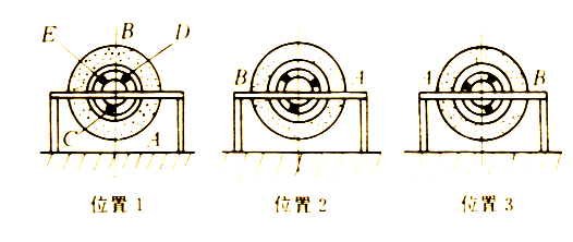 4. 轉動砂輪180°,使其處于圖位置3,微量調整D和E,使砂輪在位置3靜止不動,如砂輪在位置2和位置3靜止不動,如砂輪在位置2和位置3上都不動,即為在A、B方位上砂輪已達到平衡。