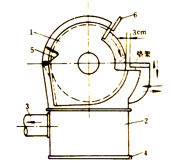 圖5為砂輪機的防護裝置示意圖。砂輪由罩1遮住,罩1由貯塵箱2、通管3與空氣管接通到吸塵器,以便定期清理塵末。罩上裝有可在外面調節的內閥板5,用來阻擋受砂輪高速回轉而向罩上方飛散的塵末。用閥板6使罩上部和砂輪之間保持最小空隙。閥板要非常牢固,因為砂輪碎裂時,閥板上時常到沖擊力。