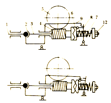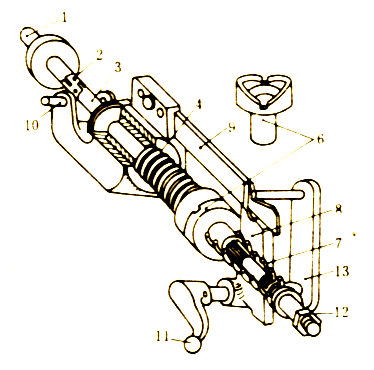 1―軸;2―萬向接頭;3―軸;4―蝸桿;5―蝸輪;6―牙嵌離合器;7―彈簧;8―杠桿;9―蝸桿支架;10―絞鏈;11―手柄;12―螺母
