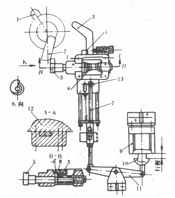 如圖9所示的機(jī)構(gòu)還可防止操作工人因沒有松開操縱踏板而發(fā)生連沖。其原理如下:曲軸旋轉(zhuǎn)一周后,隨曲軸一起旋轉(zhuǎn)的凸塊將打棒撞開,使齒條與打棒脫離,在下端彈簧的作用下齒條向上運動,經(jīng)齒輪帶動關(guān)閉器回到原來位置,擋住尾板,使離合器脫開。若要再次進(jìn)行單次行程,必須先使電磁鐵斷電,讓打棒在彈簧作用下復(fù)位并重新壓住齒條。