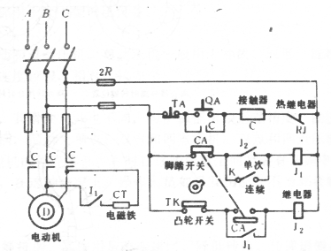 如圖10所示的控制電路也可在操作出現(xiàn)誤動時防止連沖現(xiàn)象。該電路由腳踏行程開關(guān)控制。單次行程時,切斷開關(guān)K,曲軸每旋轉(zhuǎn)一周時,由凸輪開關(guān)發(fā)出一次信號,這樣即使出現(xiàn)誤動作長時間壓合踏板,也不會發(fā)生連沖現(xiàn)象。但是凸輪行程開關(guān)TK動作超過一定次數(shù)后,也會發(fā)生故障,不能正常發(fā)訊,影響行程控制。因此,在使用中必須經(jīng)常對凸輪開關(guān)維護(hù)檢查,定期更換。