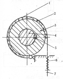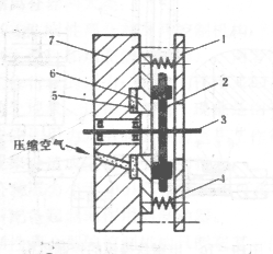 1―主動摩擦盤 2―從動摩擦盤 3―主軸 4―彈簧 5―氣室 6―活塞 7―飛輪