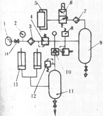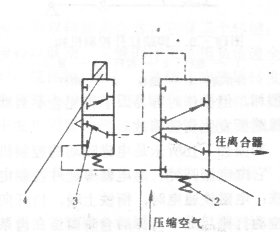 1―氣源 2壓力表 3―氣水分離器 4―減壓閥 5―離合器氣缸 6―電磁配氣閥 7―油霧器 8―壓力繼電器 9―離合器儲氣罐 10―單向閥 11―平衡器儲氣罐 12―安全閥 13―平衡器 14―閘閥