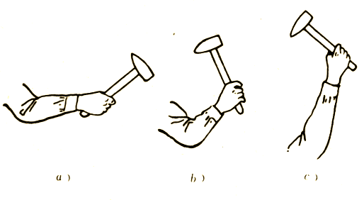 臂揮 手腕、肘部和臂部一起運動,用這種打錘法比較費力也不容易掌握,但錘擊力最大(圖2c)。