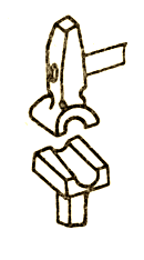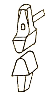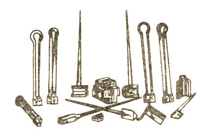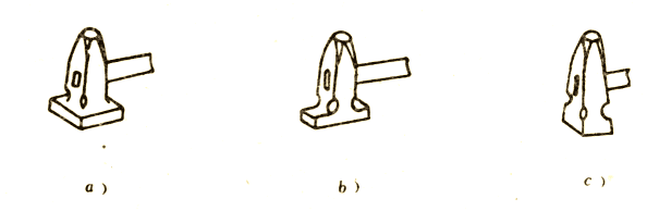 型錘主要用來卡脖壓槽,有時也用來加快拔長或增寬工序的進行。型錘上下兩個部分(圖8):上型錘裝有木柄,供握持用;下型錘帶有方形尾部,用以插入砧面上的方孔內將其固定。