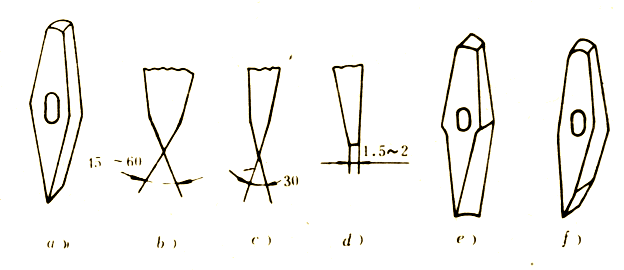 a)普通剁子 b)冷剁子刃部形狀 c)熱剁子刃部形狀 d)平口刃熱剁子 e)圓弧剁 f)單面剁