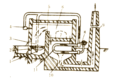 1―一次送風(fēng)管 2―水平爐 3―燃燒室 4―二次送風(fēng)管 5―火墻 6―加熱室(爐膛) 7―裝出料爐門 8―鼓風(fēng)機(jī) 9―煙囪 10―煙道 11―換熱器