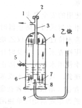 2) 中壓閉合式水封回火防止器。這種回火防止器類型很多,現(xiàn)以圖7所示,說(shuō)明其構(gòu)造和原理。正常工作時(shí),乙炔由進(jìn)氣管9流入,經(jīng)逆止閥8、分氣板7、分水板4和分水管3(減少乙炔帶水),由出氣管1輸出。發(fā)生回火時(shí),筒內(nèi)壓力增高,壓迫水面,并通過(guò)水層使逆止閥作瞬時(shí)關(guān)閉,進(jìn)氣管暫停供氣。同時(shí),爆炸氣體將筒體頂部的防爆膜2沖破散發(fā)到大氣中。由于水層也起著隔水作用。因此能比較有效地防止乙炔發(fā)生器的爆炸。