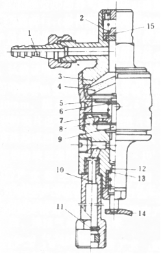 1―出氣接頭 2―調(diào)壓彈簧 3―上主體 4―粉末冶金片 5―承壓片 6―托位彈簧 7―導(dǎo)向圈 8―下主體;9―閥芯;10―進(jìn)氣管 11―濾網(wǎng) 12―復(fù)位閥桿 13―復(fù)位彈簧 14―手柄 15―泄氣閥