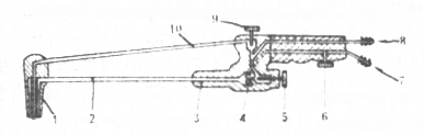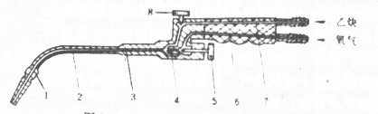 1―焊嘴 2―混合氣管 3―射吸管 4―噴嘴 5―氧氣閥 6―氧氣導管 7―乙炔導管 8―乙炔閥