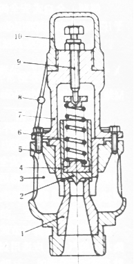 1-閥座 2-閥 3-排氣孔 4―閥套 5―閥體 6―彈簧 7―上體 8―鉛封 9―壓力調節螺釘 10―閥蓋