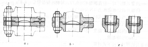 防爆片的結構主要由一塊很薄的金屬板和一副特殊的管法蘭夾盤組成。如圖2a是膜片由夾盤用埋頭螺釘夾緊后裝入容器接口法蘭上。圖2b是直接用接管的法蘭夾緊膜片。圖2c是用螺紋套管通過墊圈將膜片壓緊,采用這種結構應注意氣體流出的方向。