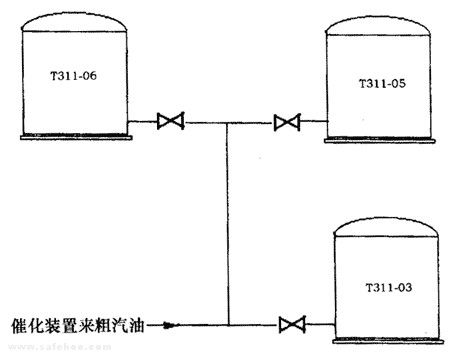 煉廠中間產品罐區,催化粗汽油罐收油時因憋壓,翹底而損壞罐體、管線,是中間罐區的常見事故之一。1998年6月26日,中南某石化總廠烯烴廠ARGG裝置首次投料試車,當日15時,粗汽油罐(T311-05)收穩定塔來粗汽油(不合格穩定汽油),收油流程如圖1所示。18時,當班人員巡檢至T311-05時,突然聽到“嘭”的一聲,T311-05的檢尺口蓋板被氣浪沖開,檢尺口發出“咝、咝”的氣流聲,罐體憋壓、翹底,罐體搖晃。當班人員迅速報告調度,要求吸收穩定裝置減少粗汽油的送出量,同時打通輕污油罐(T311-03)、粗汽油罐(T311-06)2罐的收粗汽油流程。因發現處理及時,約10min后,T311-05憋壓現象消失,經外觀檢查,罐體基本完好無損。但北向罐底周邊脫離地基約15mm,南向罐壁因連接進出口管線,罐底周邊與地基僅有松動現象。