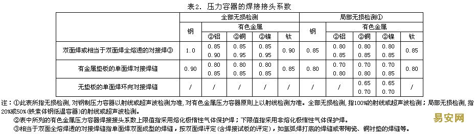基于材料常溫抗拉強(qiáng)度的考慮,鋼制壓力容器一般不得低于3.0;基于材料常溫屈服強(qiáng)度考慮,碳素鋼和低合金鋼一般不得低于1.6,高合金鋼一般不得低于1.5。按分析設(shè)計(jì)的鋼制壓力容器,基于材料常溫抗拉強(qiáng)度考慮,一般不得低于2.6;基于材料常溫和設(shè)計(jì)溫度的屈服強(qiáng)度考慮,一般不得低于1.5。否則,應(yīng)報(bào)總局安全監(jiān)察機(jī)構(gòu)批準(zhǔn),鋼制和有色金屬壓力容器的設(shè)計(jì)安全系數(shù)選取見(jiàn)表1。