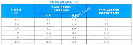 水垢的導熱系數比鋼鐵的導熱系數小幾十倍甚至幾百倍,使受熱面的傳熱性能變差,燃料燃燒所放出的熱量不能迅速地傳遞到鍋水中,使大量的熱量被煙氣帶走,造成排煙溫度升高。排煙熱能損失增加,使鍋爐的熱效率降低,而為了保持鍋爐的出力必須加大燃料的投入,提高爐膛和煙氣的溫度從而造成燃料的損失。從下表可以看出,當垢厚在1mm時,燃料損失大約增加10%,我國目前大約有60萬臺工業鍋爐,消耗的燃料幾乎占我國煤炭總產量的1/3,若以50%的運行鍋爐結垢1mm厚的話,那么煤的損失量也是一項驚人的數據。