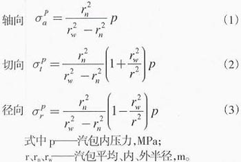 汽包主要有壓力引起的機(jī)械應(yīng)力和溫度變化引起的熱應(yīng)力。壓力產(chǎn)生的機(jī)械應(yīng)力有切向、軸向和徑向應(yīng)力三種,計(jì)算公式如下: