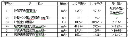 對于鍋爐設(shè)計計算,爐膛水冷壁沾污程度的嚴重與否,取決于燃料的煤灰特性,和爐膛受熱面熱負荷的高低(即爐膛容積大小)。對于燃用灰熔點溫度t1、t2、t3較低,灰成份中易污染礦物質(zhì)含量較多,以及煤的含硫量較高的燃料,容易引起爐膛水冷壁沾污。在我廠#3、#4爐的鍋爐設(shè)計計算中,我們適當取用了爐膛水冷壁沾污程度dirty=55%,經(jīng)計算后相應(yīng)的爐膛出口煙溫為1066℃和實際運行情況較吻合,由于#3、#4爐的爐膛出口煙溫計算值高,再熱器的計算受熱面面積亦較#1、#2爐少,再加上#3、#4爐其他方面的改進,所以未出現(xiàn)再熱器超溫爆管事故,現(xiàn)將#1、#2爐和#3、#4爐的設(shè)計差異列表對比如下: