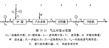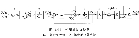 氣壓對(duì)象由一系列裝置組成,如圖18—10所示,它包括給煤機(jī)1、爐膛2、汽水系統(tǒng)3、過熱器4、汽輪機(jī)進(jìn)氣閥5和汽輪機(jī)6。相應(yīng)的方塊圖18—11,圖中方塊1表示在燃料量和風(fēng)量同時(shí)相應(yīng)變化時(shí)對(duì)發(fā)汽量的影響,它基本上是一個(gè)純滯后環(huán)節(jié)。方塊2是汽包的壓力對(duì)象。方塊4是反映過熱器的過熱蒸汽壓力對(duì)象。它們都是積分環(huán)節(jié),其他環(huán)節(jié)因動(dòng)態(tài)滯后較小,均可看成比例環(huán)節(jié)。