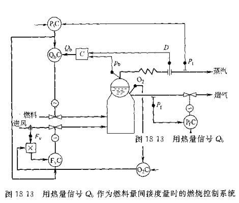 式中,Qb為代表蒸發(fā)受熱面吸熱量的信號(hào),即熱量信號(hào)。上式表明Qb可用蒸汽流量D和汽包壓力的微分信號(hào)之和來(lái)表達(dá)。引入熱量信號(hào)Qb后,燃燒控制方案改為圖18—13所示。圖中C為熱量運(yùn)算裝置。