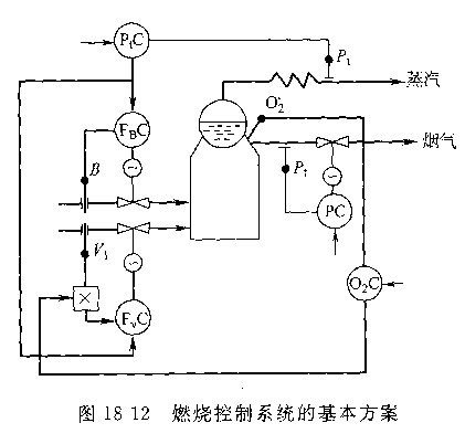 圖18—12給出了燃燒控制系統(tǒng)的基本方案,PtC是蒸汽壓力控制器,它的輸出同時(shí)去改變?nèi)紵靠刂破鱌BC和進(jìn)風(fēng)量控制器FvC的設(shè)定值,使燃燒量和進(jìn)風(fēng)量成比例變化。氧量控制器O2C的輸出作為乘法器的一路輸入,它可起到修改燃空比的作用。氧量控制器的設(shè)定值應(yīng)等于最佳含氧量,它應(yīng)隨負(fù)荷變化而有所變化。PfC為爐膛負(fù)壓控制器,因?yàn)閷?duì)象滯后很小,一般用單回路控制即能滿足要求。圖18—12方案適用于燃燒量B和進(jìn)風(fēng)量Vl均能較好檢測(cè)的情況。事實(shí)上,很多燃煤鍋爐燃料量測(cè)量的準(zhǔn)確性較低。這時(shí),宜采用熱量信號(hào)作為燃料量的間接度量,對(duì)蒸發(fā)受熱面和鍋筒列熱量平衡式,可求得以下關(guān)系式