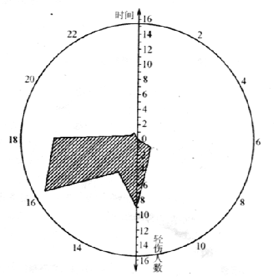 由圖3輕傷事故風向玫瑰圖可以看出,事故發生的高峰時間區段是10:00~12:00,14:00~16:00,16:00~18:00.從人機工程學原理來分析可知,這幾個時間區段都是臨近下班或加班加點時間,經過幾個小時單調、重復的勞動后,人的生物節律處于低潮期,這時往往注意力渙散,精神不集中,而導致大腦覺醒水平降低,容易產生失誤、厭煩、反應遲鈍,從而導致事故發生。另一方面,也暴露了安全管理的弊端,管理人員包括安全管理人員,在日常的現場監督管理工作中,不能科學地分配精力,上班之初,還能到處走走看看,但一兩小時后,疲了,累了,管理也松懈了,安全監控力度隨之削弱,使得事故有機可乘。