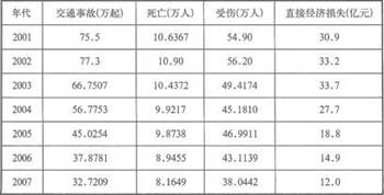 我國目前的道路交通安全狀況較差。統計數據和研究資料表明,我國目前已經進入道路交通事故的高發期,道路交通事故死亡人數居世界第一,2004年《中華人民共和國道路交通安全法》及其《實施條例》全面實施以來,2005年全國道路交通事故雖有所下降,死亡人數首次不到10萬人,并逐年呈下降趨勢,但絕對數依然巨大,總體形勢依然嚴峻(見表1)。同時我國人口眾多,地域寬廣復雜,交通管理水平參差不齊,道路交通事故造成的危害表現得尤為突出。就最重要的方面—人來說,交通事故已經成為危及人民生命財產安全的“第一殺手”,在各類事故中死亡人數均約占3/4,且有不斷上升的趨勢。