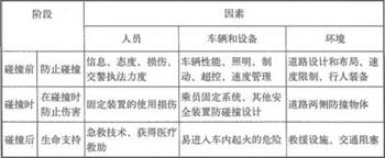 在20世紀70年代,美國人WILLIAMHADDON提出了著名的“哈頓矩陣模型”,闡述了在機動車發生碰撞前、碰撞時和碰撞后的三個階段中互相作用的三