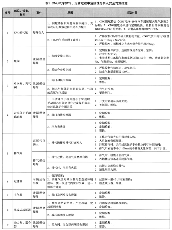 2.6 CNG汽車加氣、運營過程中危險性分析見表1。