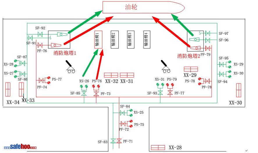 (6)若果是輸油臂、輸油管線、閥門、儀表、金屬軟管接頭等處因漏油著火,滅火二組開啟消防炮塔1處的泡沫炮對著火部位進行撲救,開啟消防炮對著火部位附近的管線和設(shè)備進行冷卻。