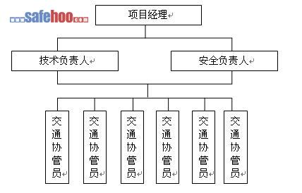 項目部將設專職安全員兩名,另配備十名交通指揮人員,一天兩班,白班五人,夜班五人。在值班期間,交通指揮人員必須穿著反光標志服,配合交警、路政部門進行交通管理,確保行車的安全通暢。