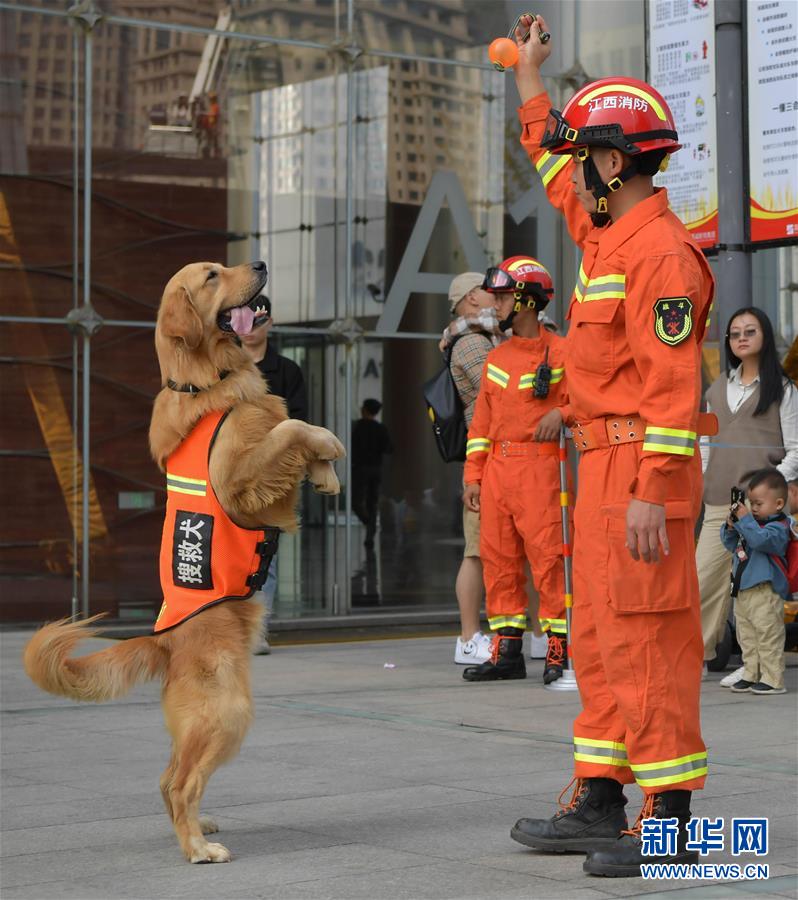 11月3日,在江西省“119消防宣傳月”活動(dòng)啟動(dòng)儀式現(xiàn)場(chǎng),消防人員在向市民展示搜救犬技能。