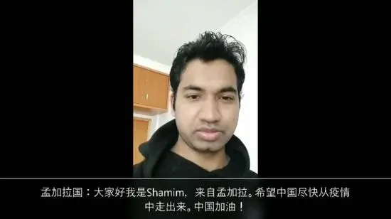 來自孟加拉國(guó)的Shamim,在浙江湖州留學(xué)和實(shí)習(xí)近一年了。對(duì)于中國(guó)奮力抗擊疫情的表現(xiàn),他深受感動(dòng)。日前,Shamim聯(lián)系了意大利、哈薩克斯坦、南非等12個(gè)國(guó)家的朋友,邀請(qǐng)他們一起錄制了一段視頻,鼓勵(lì)中國(guó)朋友們繼續(xù)堅(jiān)持,戰(zhàn)勝疫情。“相信中國(guó)的朋友,看到這段視頻,會(huì)很高興。我們和他們一起加油!”他說。